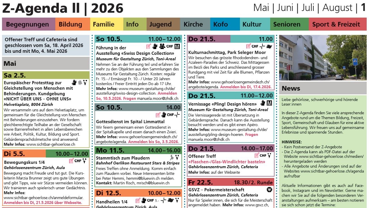 Unsere gemeinnützige Selbsthilfeorganisation sichtbar GEHÖRLOSE ZÜRICH setzt sich im Kanton Zürich für die Anliegen von gehörlosen, schwerhörigen und hörsehbehinderten Menschen ein. Unser Ziel ist die Gleichstellung von Menschen mit einer Hörbehinderung und damit der barrierefreie Zugang zu allen Bereichen des Lebens. Hierzu setzen wir auf Inhalte in Gebärdensprache und bauen gezielt Brücken zur hörenden Mehrheit. Mit unseren gehörlosengerechten Angeboten und Dienstleistungen unterstützen wir Betroffene in ihrer persönlichen Entwicklung und pflegen die Gemeinschaft der Gebärdensprachnutzer:innen.