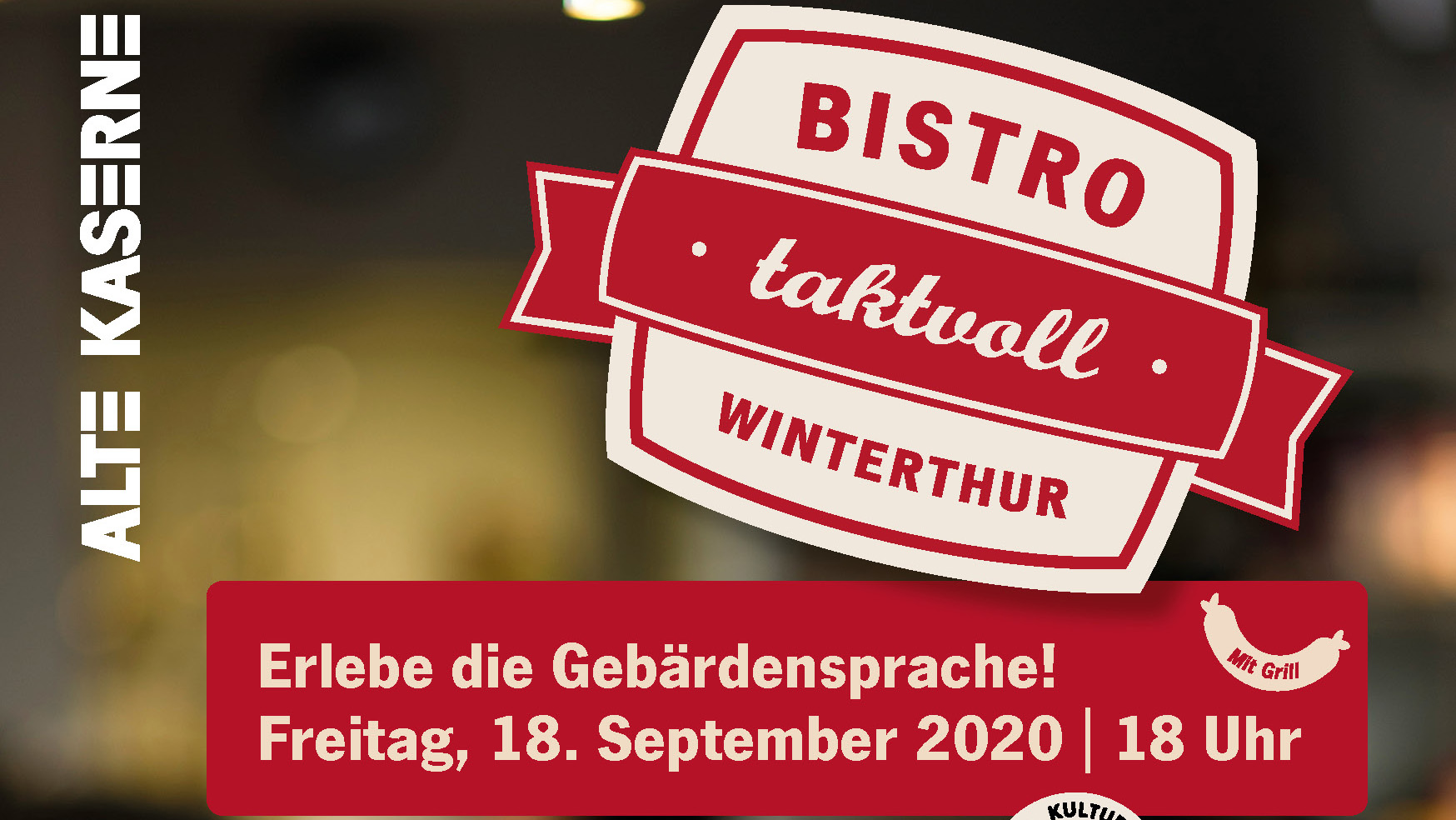 Seit 2013 finden im Bistro Alte Kaserne regelmässig Treffen für Gehörlose und Hörende statt, bisher unter dem Namen «Café des Signes». Neu heisst der Anlass «Bistro Taktvoll», angelehnt an die Kulturveranstaltungen, die von der Selbsthilfe für Gehörlose und Hörbehinderte «sichtbar GEHÖRLOSE ZÜRICH» und der Alten...