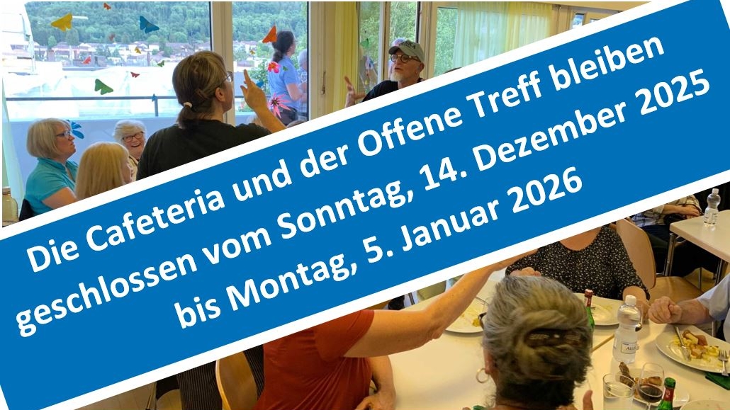 Die Cafeteria und der offene Treff bleiben während der Weihnachtsferien geschlossen vom Sonntag, 14. Dezember bis und mit Montag, 5. Januar 2026. Ab Dienstag, 6. Januar ist die Cafeteria wieder geöffnet. Der offene Treff findet wieder am Donnerstag, 8. Januar 2026 statt. Frohe Festtage und...