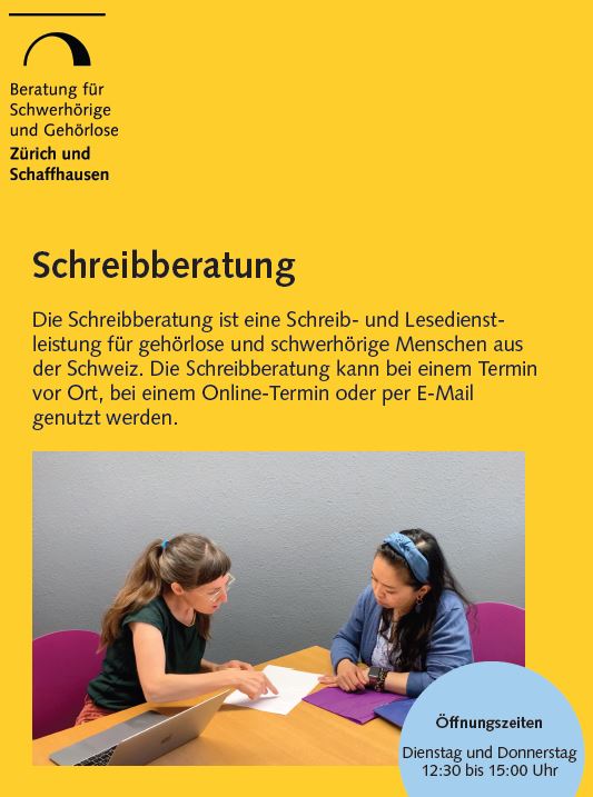 Die Schreibberatung ist ein Angebot für gehörlose und schwerhörige Menschen aus der Schweiz. Sie findet in Deutsch und Deutschschweizer Gebärdensprache statt.