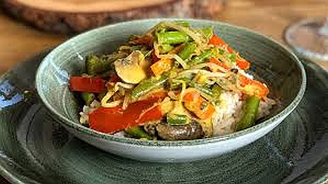 Gemüse-Wok asiatisch mit Tofu, Reis und Dessert