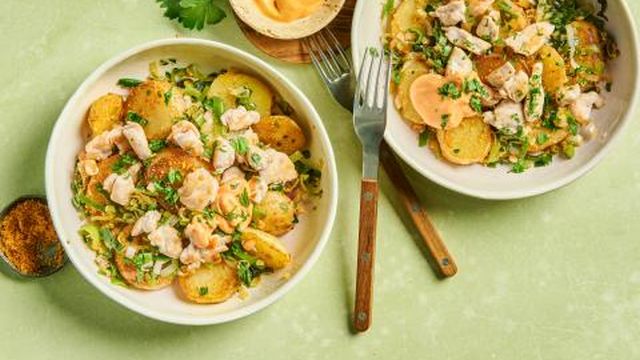 Gebratene Kartoffeln mit Poulet und Lauch an einer